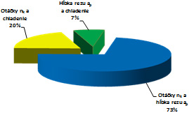 Na obr. 9 najväčší percentuálny rast predstavuje chladenie, pričom otáčky majú rastúci vplyv a hĺbka rezu klesajúci. Tieto dva faktory spôsobujú rast faktora chladenia. Výsledkom týchto zistení, pri takto pôsobiacich faktoroch po obrobenej ploche pre oceľ E295 sa dá predpokladať ďalší vplyv narastania chladenia pri odlišnom pôsobení ďalších dvoch skúmaných faktoroch.
