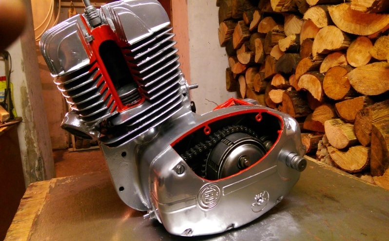 1 - Valec, 2 - Zapaľovacia sviečka, 3 - Hlava valca, 4 - Karburátor, 5 -Spojkový kôš, 6 -Štartovacia- kvalt páka, 7 -Blok motora, 8 - Výfukový kanál